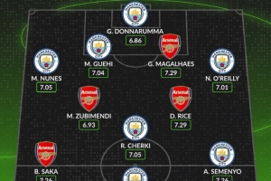 曼城+阿森纳本赛季英超评分最高阵:哈兰德领衔曼城7人,赖斯在列